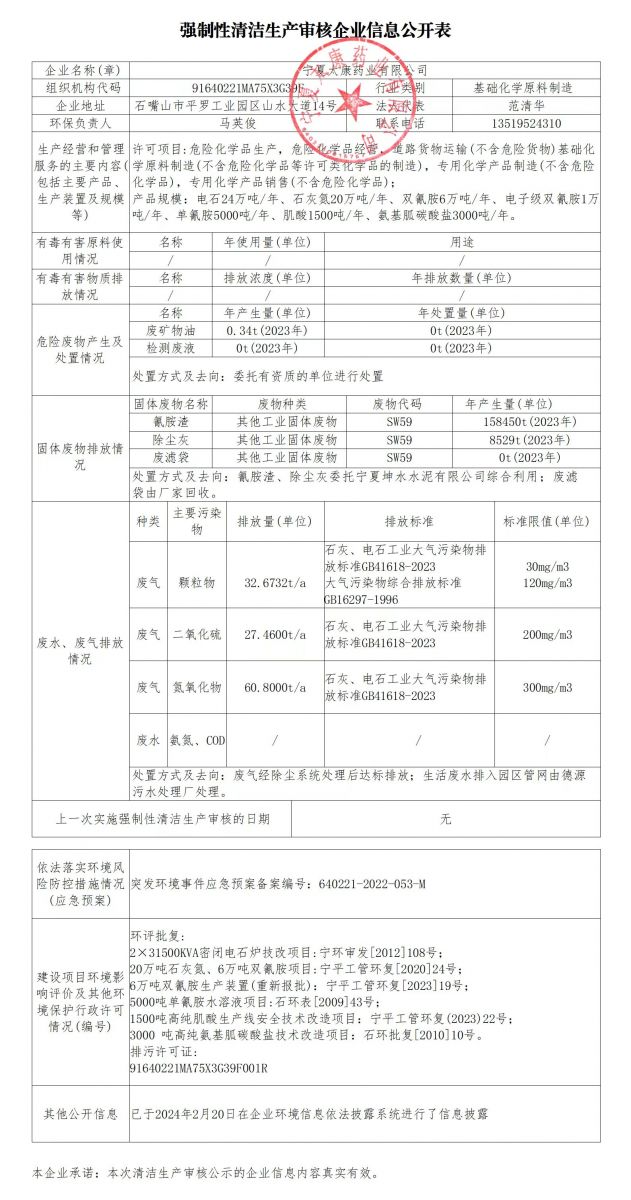 根據(jù)《自治區(qū)生態(tài)環(huán)境廳、發(fā)展和改革委員會關(guān)于公布 2024 年開展強制性清潔生產(chǎn)審核重點企業(yè)名單的通知》(寧環(huán)發(fā)〔2024〕39 號)文件,公司被納入自治區(qū) 2024 年開展強制性清潔生產(chǎn)審核重點企業(yè),現(xiàn)將公司相關(guān)信息公開公布。